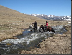 We had a night in a jailoo last night which is a pasture at about 2700m….we were a bit clogged up with what we assumed was a horse dung fire to keep us warm during the night! We went out on a couple of horses for two hours in the afternoon up to about 3200m…and there was a baltic wind. We turned back as Ciara turned to ice, which is probably just as well as she’s walking like John Wayne today (or at least trying to walk). The horses had a remarkable knack of farting while walking – “Sound of Music” Kyrgyz style. Later I managed to drink some kumuz….which tastes as good as it sounds – fermented mares milk. I managed a few though.