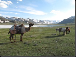We had to check in at an army border checkpoint with our permit before starting as we were in a national park right next to the Chinese border. Despite being so far away from a major town there was a small village here and a bunch of nomad’s gers and livestock. The first day’s trek took us away from them into valley’s where the herder’s didn’t move to until later in the year so we never met anyone else – just us, our cook, our guide, our horseman and a pack camel carrying the gear. We walked over a pass at about 2600m which brought us up to the snowline. It’s been a harsh winter here and a very quick spring where loads of snow has melted in a few weeks…..this as great for us as it meant the majority of the walk was in grassy areas or a dirt track, no families had moved into the area yet, and the surounding mountains were still covered in snow giving us our most scenic camp spots to date anywhere!